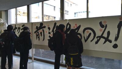担任団の先生方からの応援のメッセージです。「サクラサケ!前進あるのみ!」の手島先生の字に、次々と花が咲き始めています。3年生の皆さんもぜひ意気込みを書いて貼りましょう。