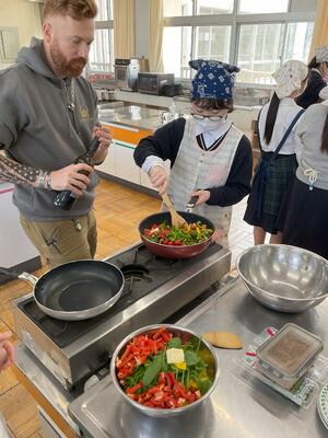 3月27日(金)、語学部と食物部によるコラボクッキングを実施しました。ALTのクリスチャン先生のリードのもと、「肉とチーズがたっぷり入ったトマトソース」に挑戦。黒板に英語でレシピや手順を書いていただき、まずは、クリスチャン先生と一緒に生徒達はスーパーへ買い出しに出かけました。