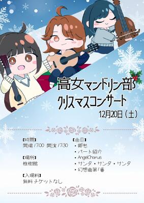 クリスマスコンサートを行いました! 投稿日時 : 2025/12/26 高女教職員 12/20(土)本校椎樹館で、高女マンドリン部恒例のクリスマスコンサートを行いました。 2/1に行われる県高校ギター・マンドリンコンクールで演奏する「幻想曲第1番」や学年ごとの合奏など、クリスマスソングを含め、全4曲を演奏しました。 当日は、多くの方においで頂きありがとうございました。 コンクールに向け、引き続き頑張っていきますので、応援よろしくお願いします! Tweet {{options.likeCount}} {{options.likeCount}}